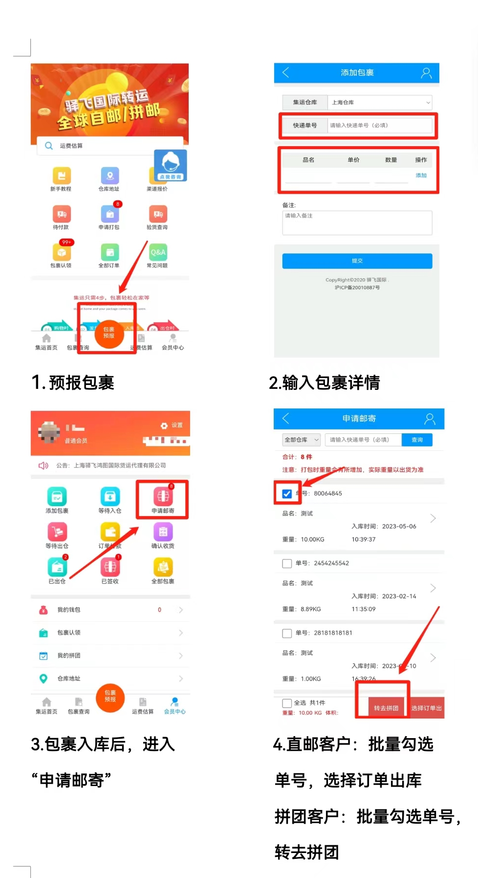 1. 關(guān)注驛飛鴻圖國際轉(zhuǎn)運 公眾號 2. 進(jìn)入會員中心 3. 右上角寫著您的這個微信號對應(yīng)的會員號 4. 然后把購物平臺上的郵寄地址填寫成? 5. 收件人:會員號名字 電話號碼:15221328914/18916380071 郵政編碼:201706 收貨地址:上海市青浦區(qū)香花橋街道北青公路7909號4棟4樓(您的會員號)驛飛國際